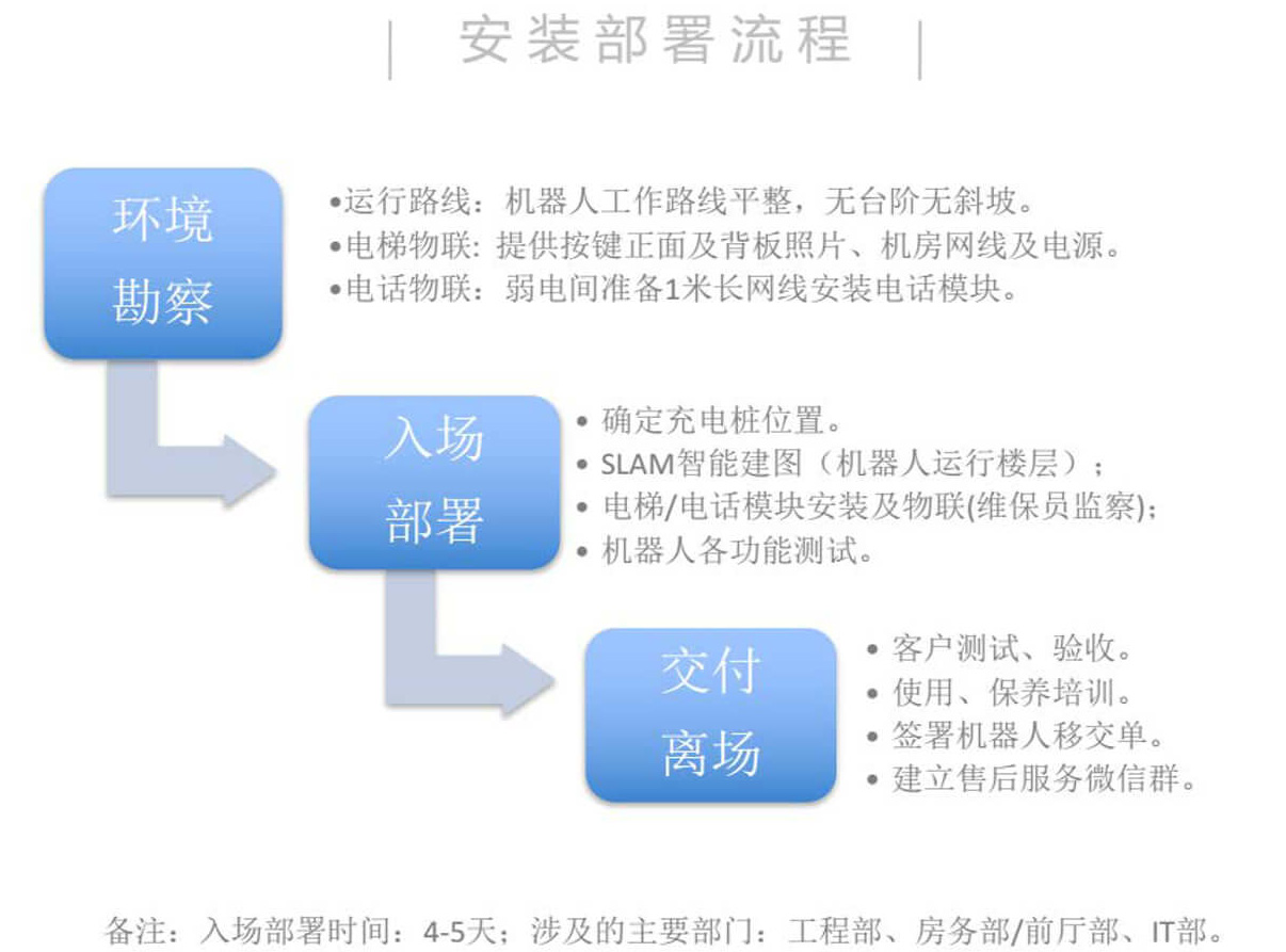 一般機(jī)器人的安裝和部署加上測(cè)試和對(duì)員工培訓(xùn),一般4-5天。具體安裝部署的流程如下:其中環(huán)境勘察這一步是遠(yuǎn)程處理,對(duì)于一些特殊項(xiàng)目,公司也會(huì)根據(jù)酒店反饋的硬件情況安排工程師具體現(xiàn)場(chǎng)勘察。